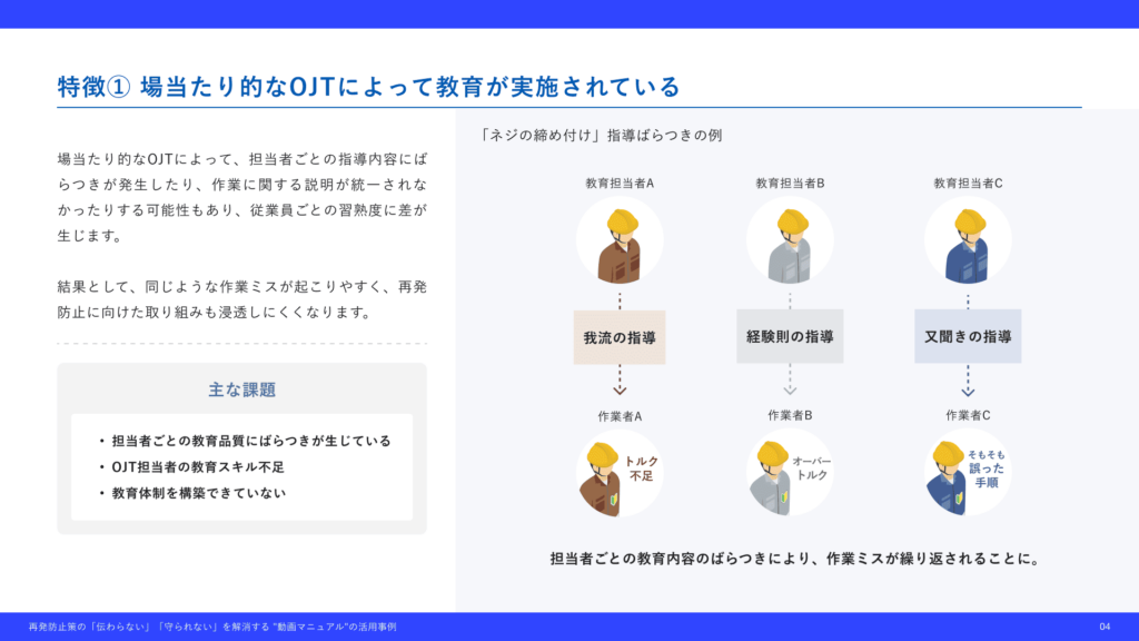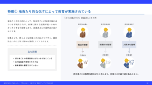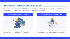 OJT教育の品質にばらつきがあり、従業員ごとの習熟度に差が出ている現場