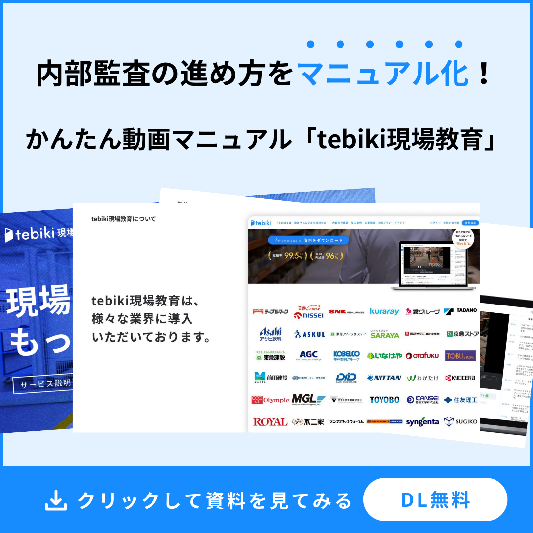 また「現場教育システムtebiki」を導入することで、内部監査の進め方をわかりやすくマニュアル化でき、内部監査員のスキル向上にも役立てられます。