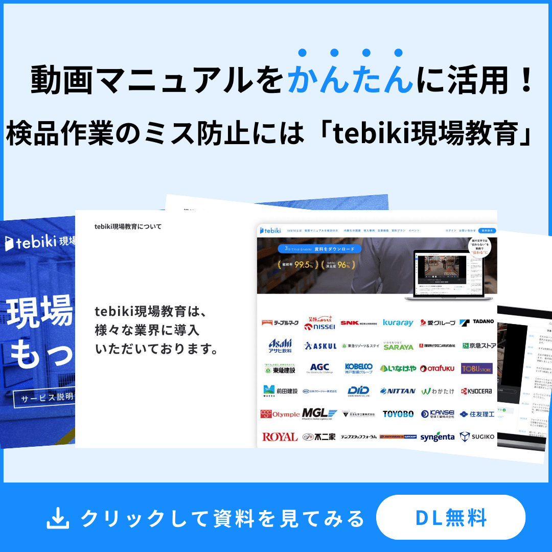 そのなかでも、標準作業の徹底は検品ミスを防ぐための基盤となります。誰が担当しても同じ手順で作業を進められるようにするには、現場の動作を視覚的に理解できる「動画マニュアル」の活用が有効です。当記事で紹介した動画マニュアル作成ツール「tebiki現場教育」の詳しいサービス概要を知りたい方は以下の画像をクリックして資料をご覧ください。