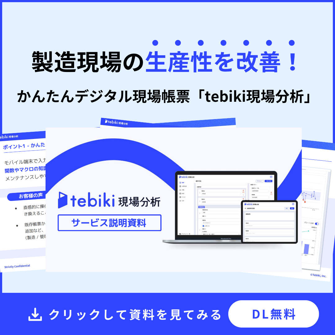 今回ご紹介した「tebiki現場教育」と「tebiki現場分析」は、製造現場の生産性向上の達成に役立つ2つのツールとなり得ます。両者のサービス概要資料は、以下のフォームを入力いただくとご覧いただけますので、生産性向上策の1つとしてご検討ください。