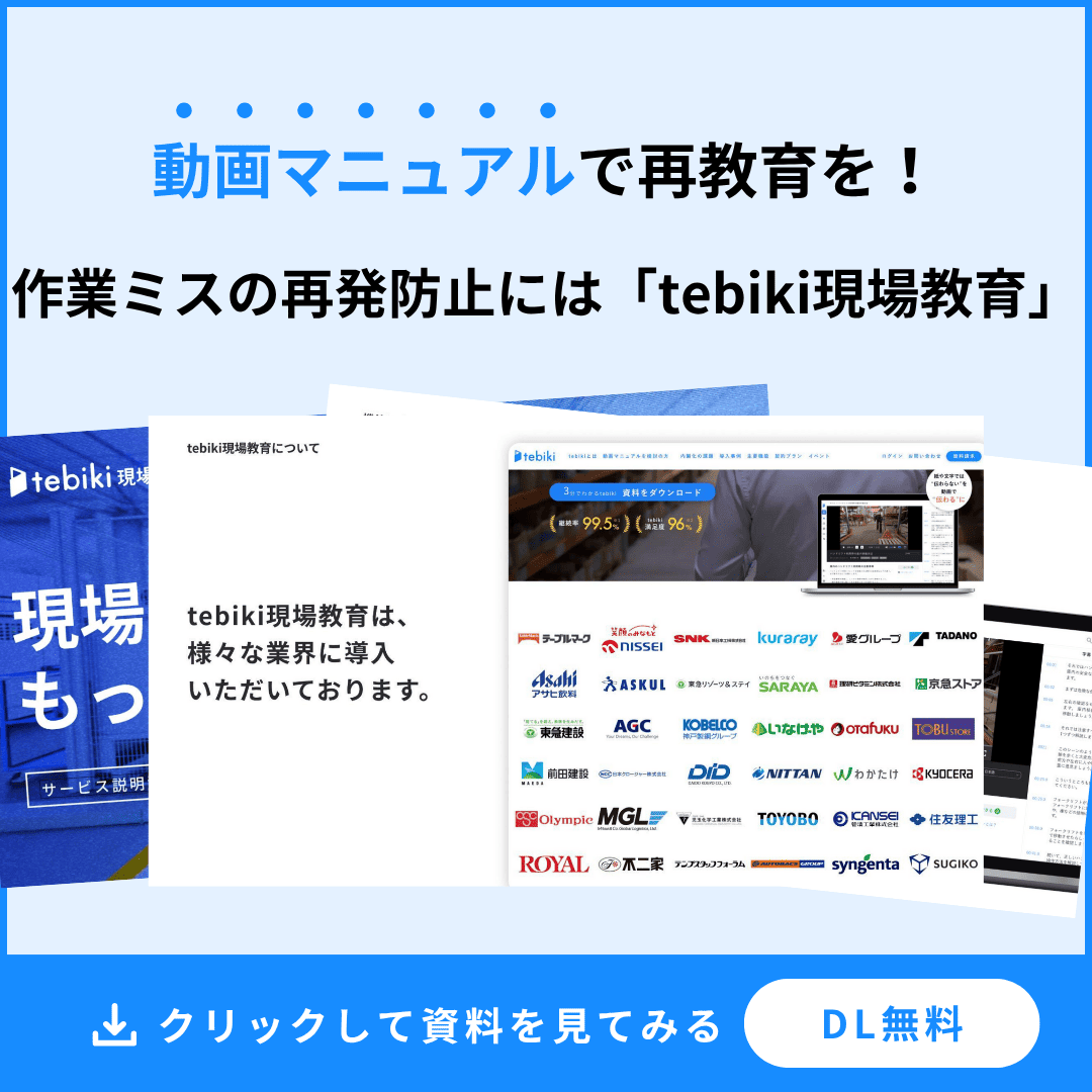 なお、この記事で紹介した「tebiki現場教育」は、動画マニュアルによる新たなアプローチによる教育によって、作業の標準化を実現し作業のミスを防止することにつながります。