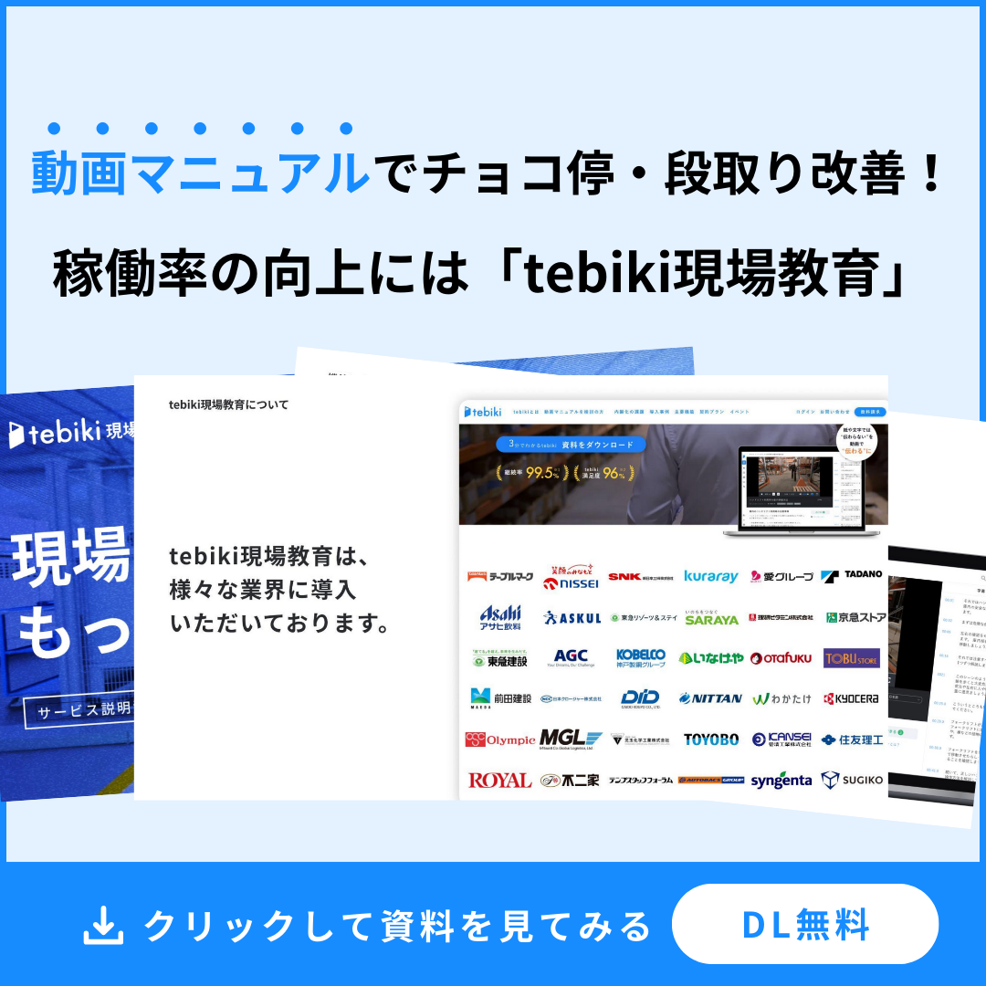 tebiki現場教育の詳細機能や活用事例について詳しく知りたい方は、以下のPDF資料もあわせてご覧いただくと、tebikiを現場でどのように活用できるのか・どのように稼働率向上に貢献するのかが具体的にイメージできます。