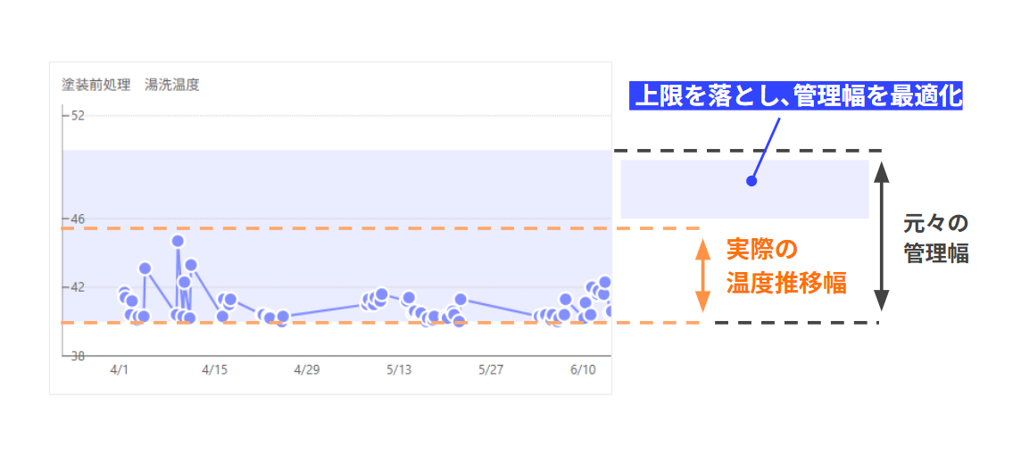 また、原価低減につながった事例もあります。これまで湯洗温度は「40~50℃」で管理していましたが、実際の推移は「40~46℃」に収まっていることが分かりました。そこで管理幅を見直し、上限を46℃に設定しました。一般的に湯洗温度を1℃下げると燃料消費は約2〜2.5%削減できると言われています。今回の最適化によって、品質を保ちながら不要な加熱を防ぎ、エネルギーコスト削減を通じて原価低減を実現しました。