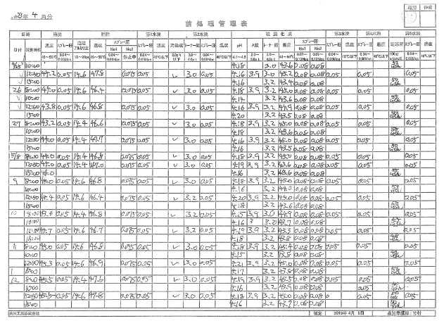 竹村様:「前処理管理表」は、製品を塗装する前に行う工程で管理している表になります。塗料の密着を良くするために下地処理を行う際、最初にお湯で鉄板の油分を洗い流す、いわゆる湯洗が必要になります。湯洗にはお湯の温度が重要になるので、温度が必ず40〜50度の範囲に入っているかをチェックしています。他にも、化成処理で素材の表面に化成の被膜をつけることになり、処理液のpH、A値といった薬品の濃度などをチェックします。この辺りが適正範囲に入っていないと、塗装の剥がれなどに繋がりますので、重点的に検査・管理をしています。