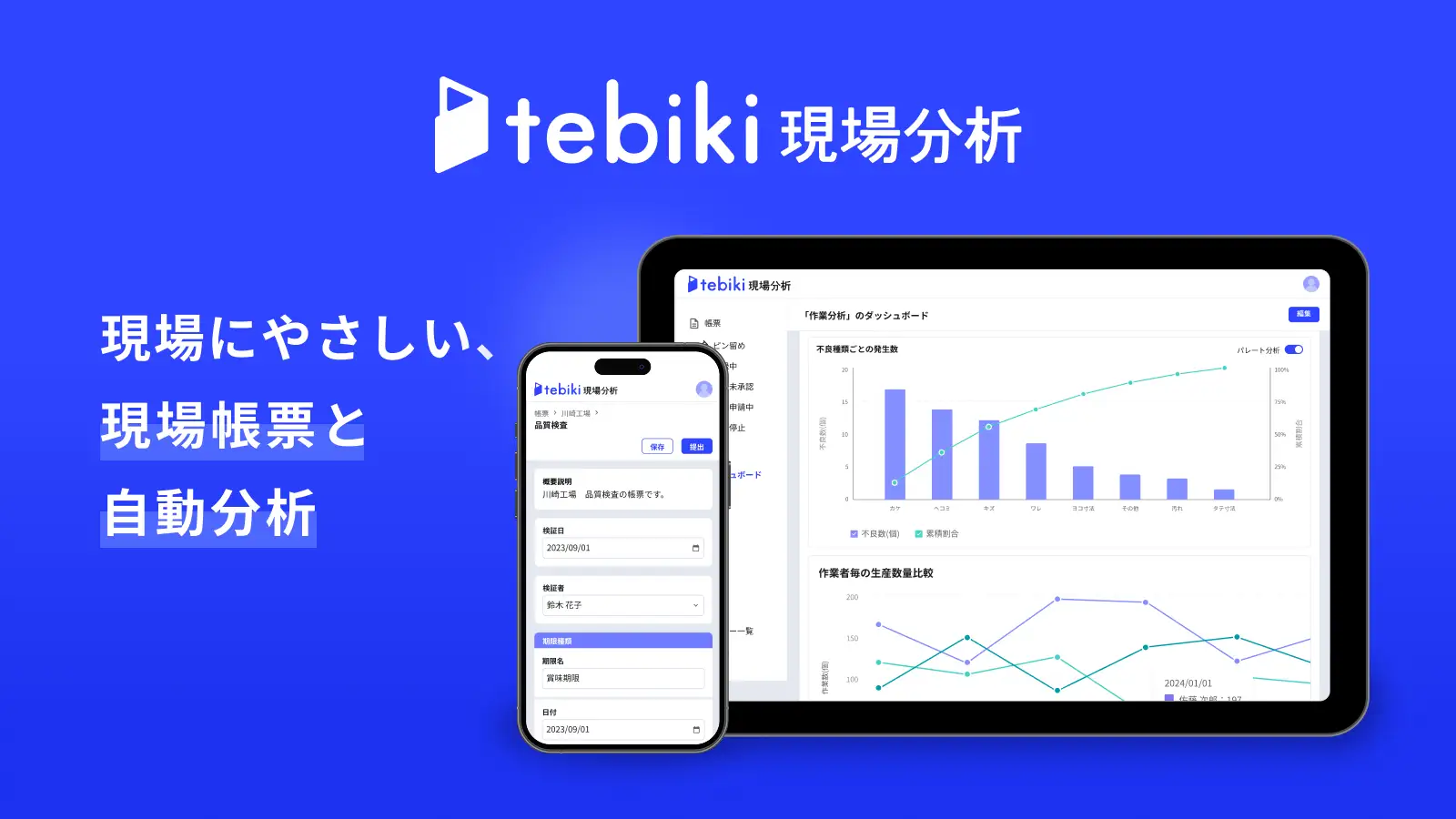 tebiki現場分析は、製造業などの現場で用いられる製造日報、稼働日報、設備点検表といった現場帳票の作成、記録、承認、分析が簡単にできるクラウドサービスです。帳票作成や記録入力がしやすく、紙では難しかった画像の記録や、遠隔地・リアルタイムでの記録も可能になります。